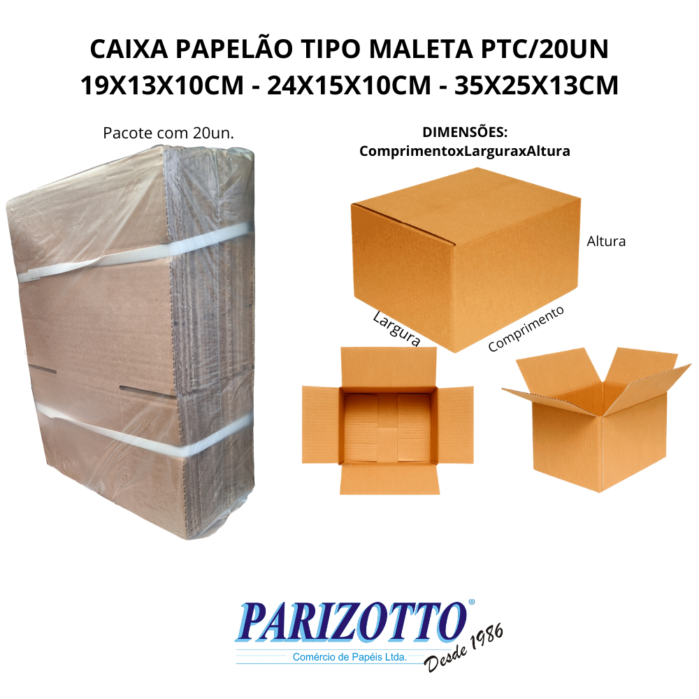 CAIXAS PAPELÃO PARA E-COMMERCE PTC/20UN TIPO MALETA 19X13X10, 24X15X10 e 35X25X13CM EVOLUÇÃO